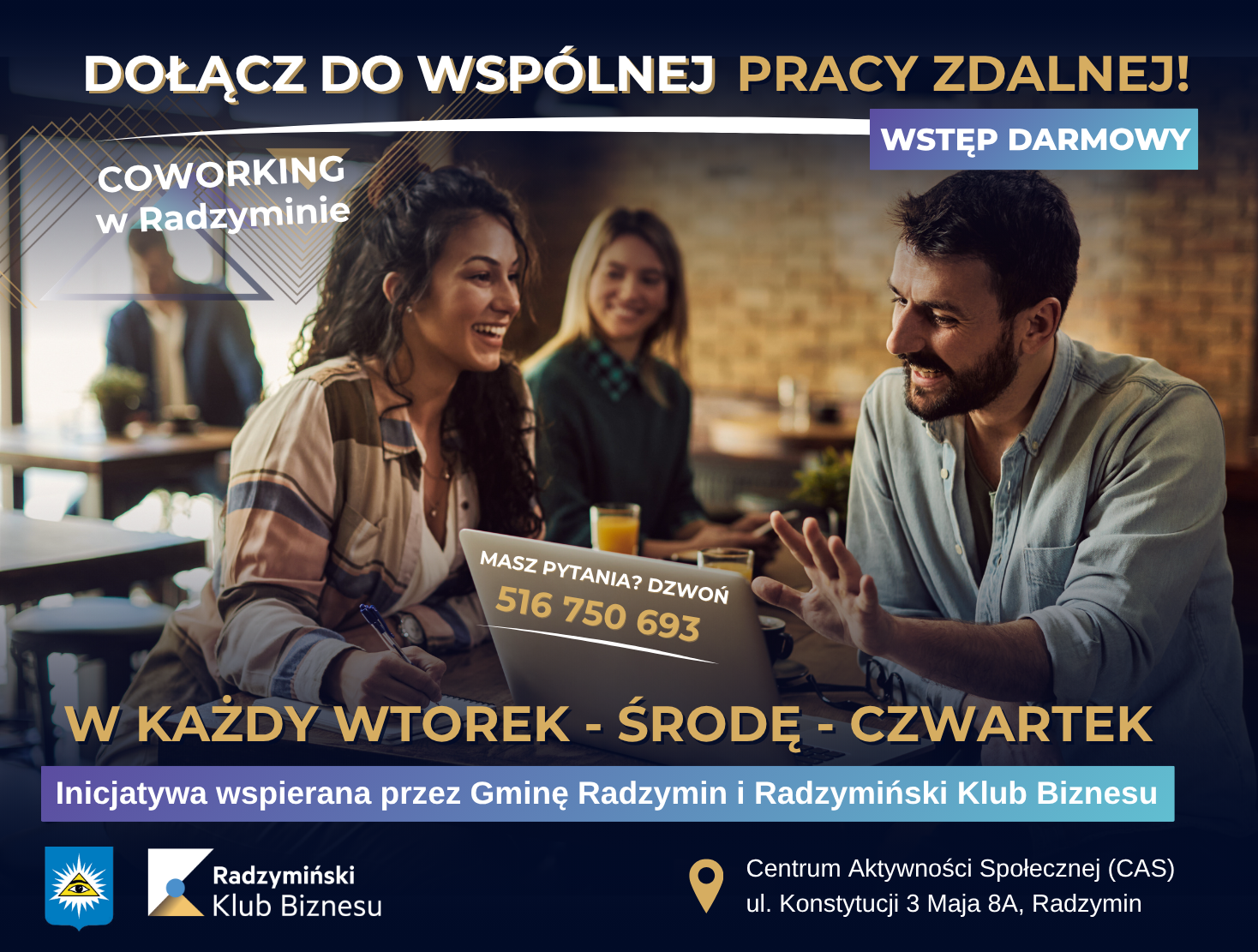 Od połowy marca 2026 r. ruszyły spotkania coworkingowe w Centrum Aktywności Społecznej w Radzyminie. Wspólnie z Gminą Radzymin zapraszamy przedsiębiorców i mieszkańców pracujących zdalnie na do wspólnej pracy i wyjścia z domu! To świetna okazja, aby popracować w inspirującym otoczeniu, poznać nowych ludzi i wymienić się doświadczeni